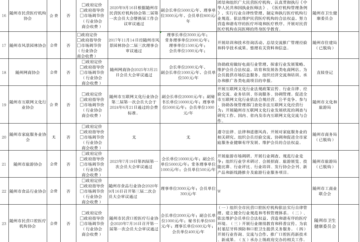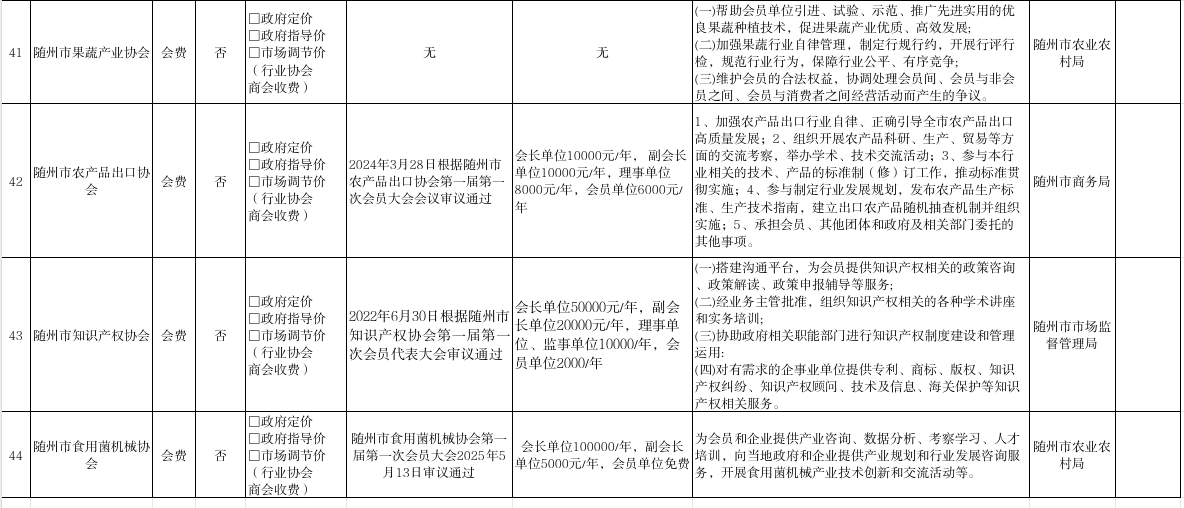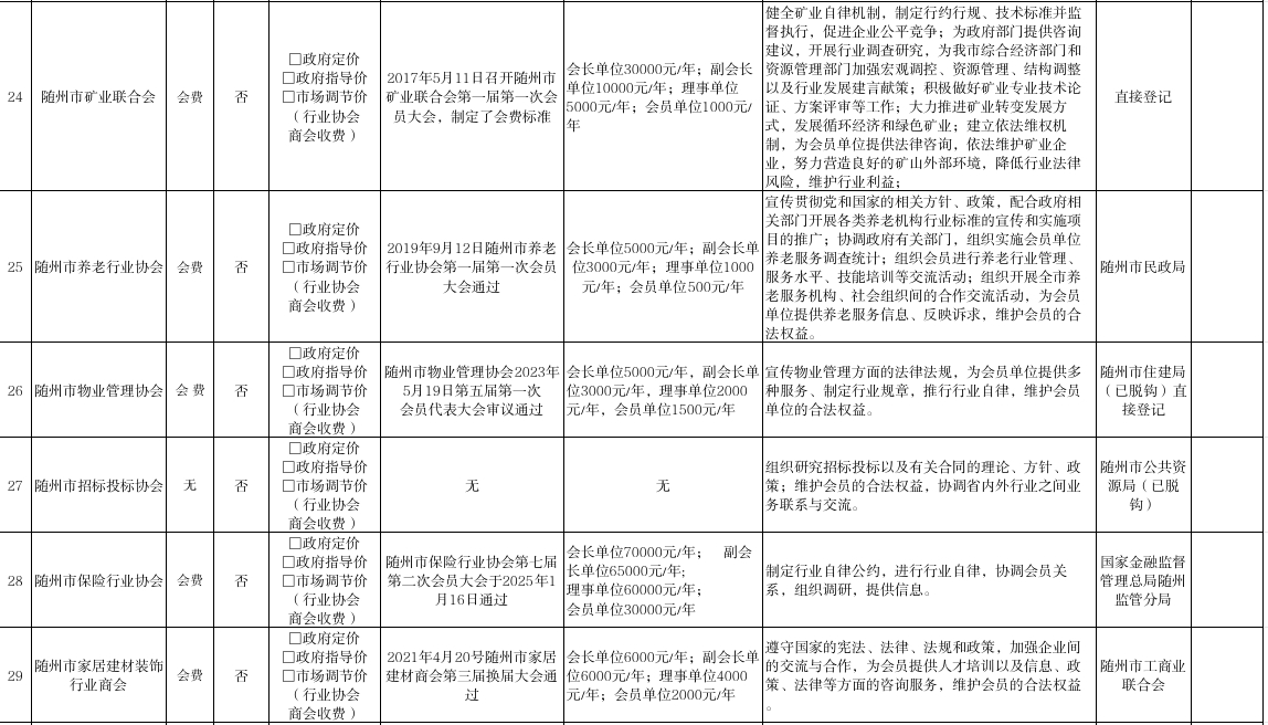 随州市市级行业协会商会收费目录清单(截止2025年5月31日)